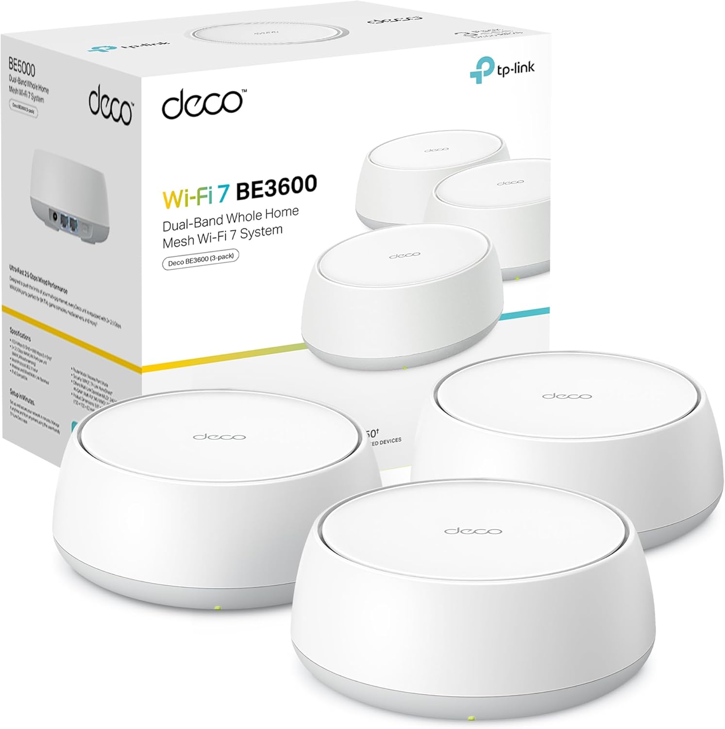 TP-Link Deco BE3600 3-Pack - Mesh Wi-Fi7 de Doble Banda hasta 3,6GBs, backhaul híbrido inalámbrico y por Cable, MLO, 2 Puertos multigig de 2,5GBs por Unidad, protección HomeShield